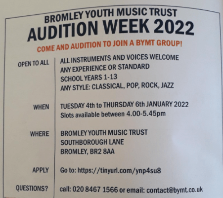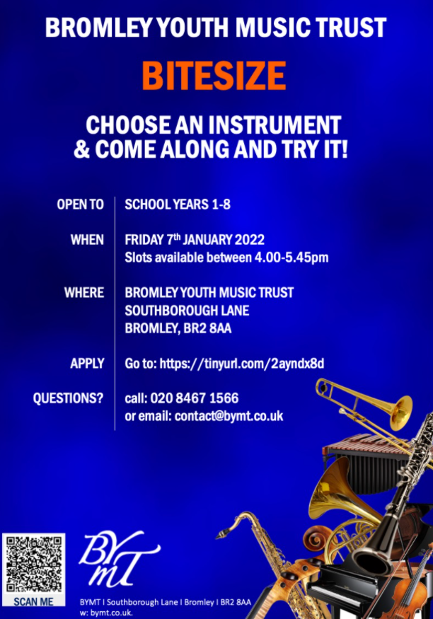 BYMT ‘Bitesize’ on Friday 7 January 2022. Choose an instrument & come along and try it! Booking essential – click here