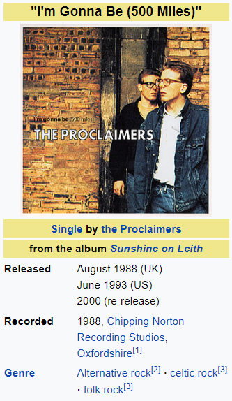 “I’m Gonna Be (500 Miles)” is a song written and performed by Scottish duo the Proclaimers, and first released as the lead single from their 1988 album Sunshine on Leith. The song reached number 11 in the UK Singles Chart on its initial release and has since become their most popular song worldwide.