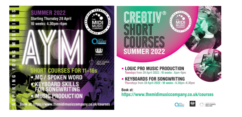Registration is now open for summer term AYM (Aspiring Young Musicians) courses The AYM Courses include Ableton Music Production, MC/Spoken Word and Keyboards for Songwriting (Aged 11-16s) and Cre8tiv® courses include Logic Pro Music Production and Keyboard Skills for Songwriting (aged 16+).