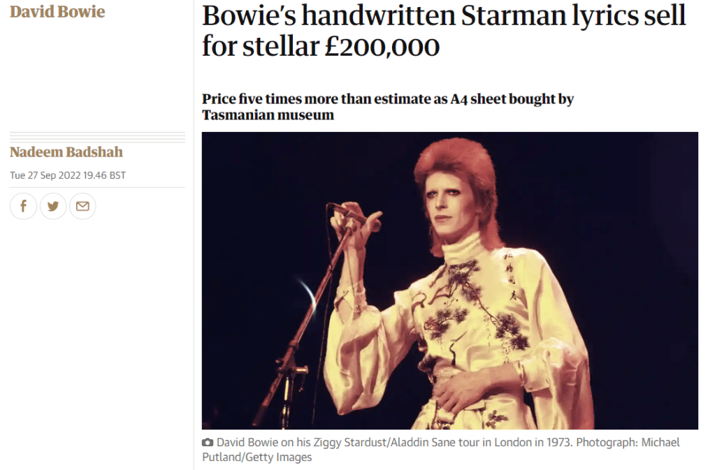 Upon release, “Starman” sold favorably and earned positive reviews. Following Bowie’s performance of the song on the BBC television programme Top of the Pops, the song launched to number 10 on the UK Singles Chart and helped propel the album to number five. It was his first major hit since “Space Oddity” three years earlier. The performance made Bowie a star and was watched by a large audience, including many future musicians, who were all impacted by it; these included Boy George, Bono, Robert Smith and Ian McCulloch. Retrospectively, the song is considered by music critics as one of Bowie’s finest.