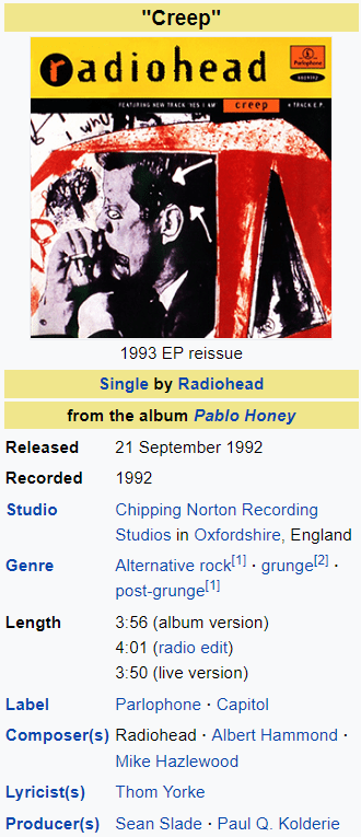 Though they achieved greater commercial and critical success with later albums, “Creep” remains Radiohead’s most successful single. It was named one of the greatest debut singles and one of the greatest songs by the American Rolling Stone magazine.