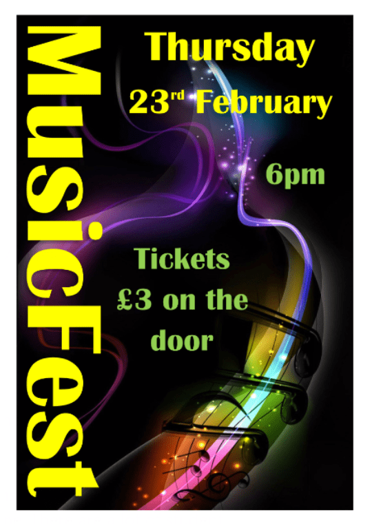 We have had to change the date of MusicFest so it will now be held on Thursday 23rd February at 6pm. Please sign up here. The last day for entries will be Monday 20th February.