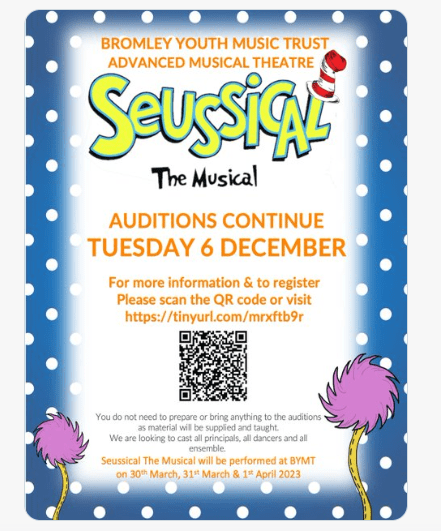Seussical weaves together many of the much-loved characters and stories from Dr. Seuss including the Cat in the Hat, Horton the Elephant, the Whos, Getrude McFuzz, Amayzing Mayzie and many more. Seussical is a musical for all ages that has been performed on Broadway and the West End and is written fantastically well, with fun and exciting music covering a multitude of styles. It will be a brilliant experience to be part of featuring a live band, props, costumes, professional sound and lights and you will also get to work with a West End creative team.