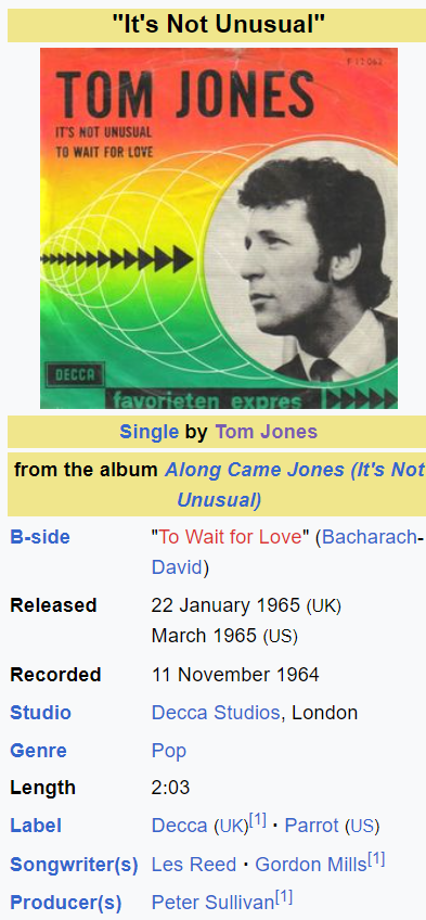 Sir Thomas Jones Woodward OBE (born 7 June 1940) is a Welsh singer. His career began with a string of top 10 hits in the 1960s and he has since toured regularly. He has sold over 100 million records, with 36 Top 40 hits in the UK and 19 in the US, including “It’s Not Unusual”, “What’s New Pussycat?”, the theme song for the James Bond film Thunderball (1965), “Green, Green Grass of Home”, “She’s a Lady”, “Sex Bomb”, and a cover of Prince’s “Kiss”. (Wikipedia)