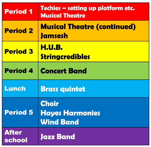 - The music classrooms will be available for coats, instrument cases etc. Please arrive in enough time to warm up and get organised.