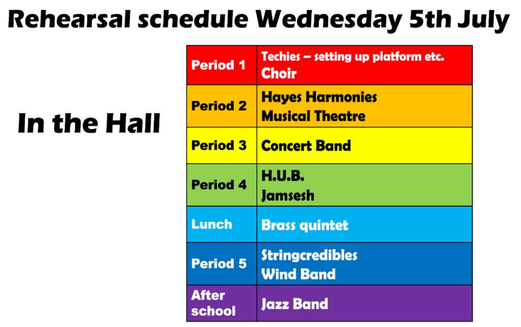 Below is the rehearsal schedule for the day of the concert (Wed 5th July ). This is the strike day.