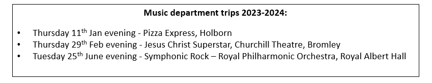 The parents/carers of students in Choir, Musical Theatre and Concert Band should have already received the tour email with details of how to sign up. Please contact Miss W if you did not receive the email.