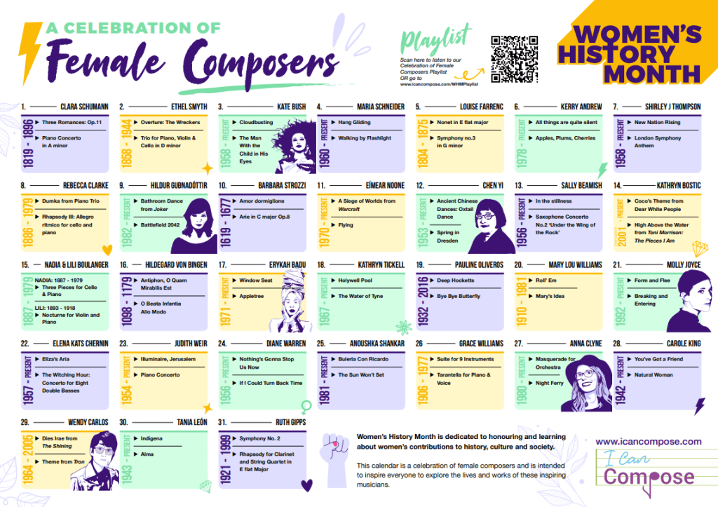 This calendar is a celebration of female composers and is intended to inspire you to explore their lives and musical works.