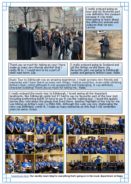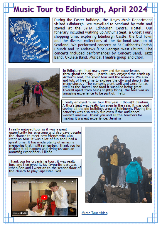 Thank you to those of you who wrote a review of music tour. Look out for your reviews in the school newsletter and displayed in the music corridor.