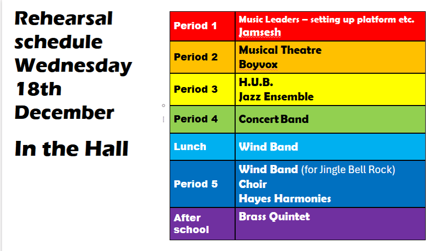 Here’s the rehearsal schedule for the day of the concert (Wednesday 18th December). Please make a note of when you are needed and make sure you have your instrument/music in school with you on that day.